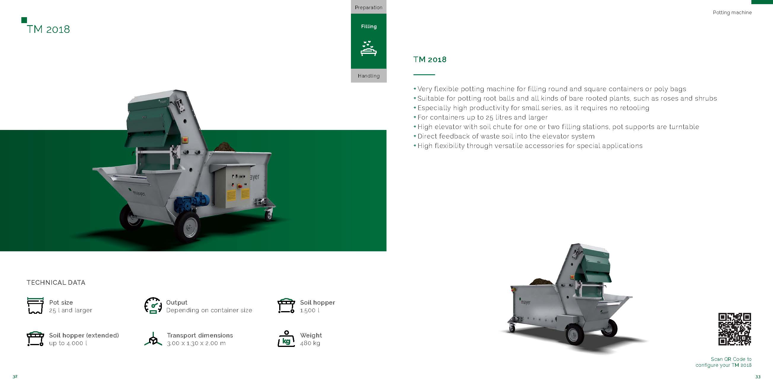 TM 2018是一款多功能產(chǎn)品,可用于填充圓形或方形盆以及不帶鉆孔的美植袋。TM 2018上盆快速,可靠且經(jīng)濟(jì)性高,可用于盆栽和各種裸露植物的上盆工作,例如玫瑰,灌木,攀援植物和果樹(shù)。填裝機(jī)也特別適合于高大的木本植物。