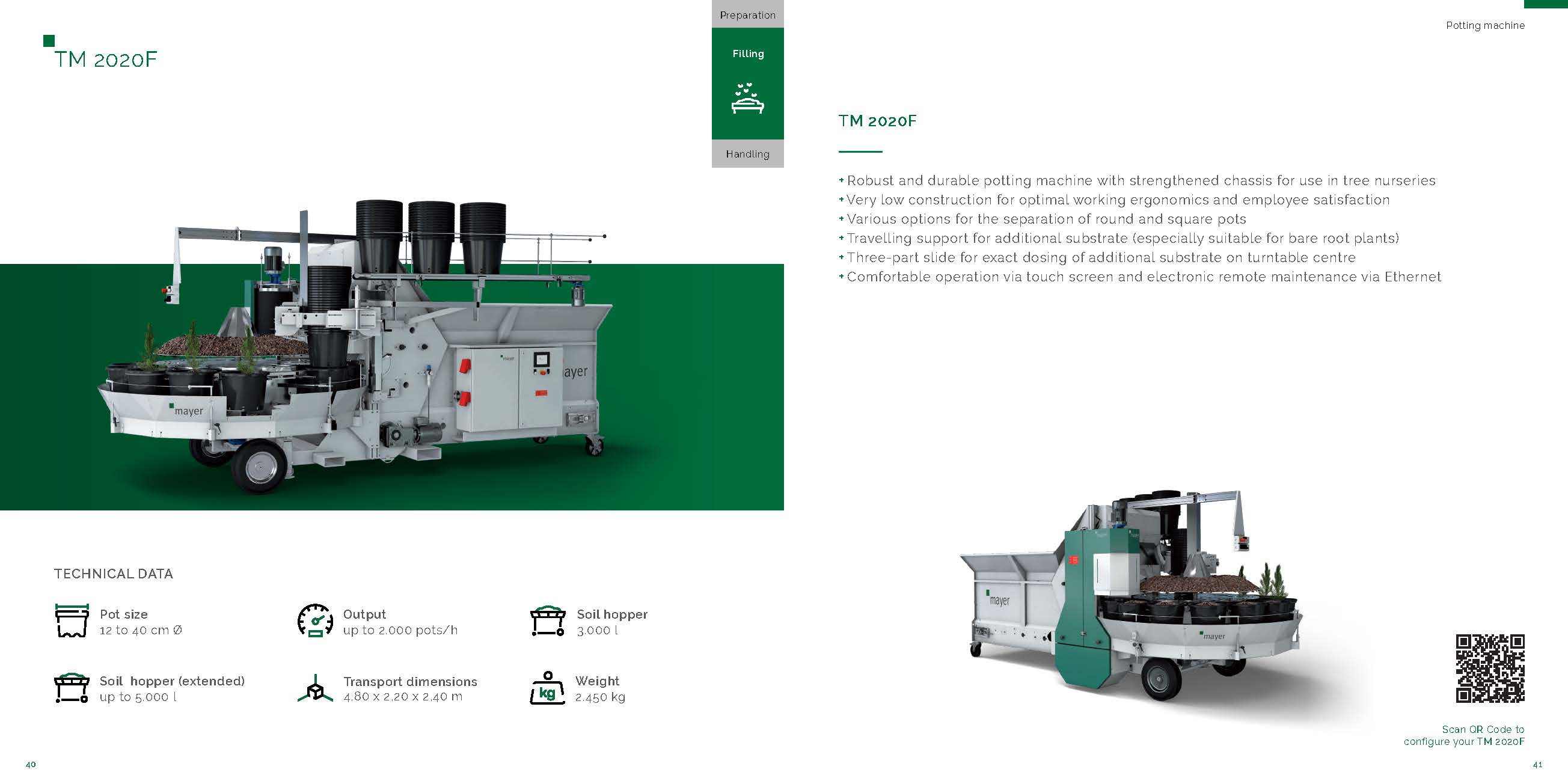 作為廣受歡迎的TM 2020的繼任者,我們很高興為您提供我們最新研發(fā)的TM 2020F,這是一種專為苗圃設(shè)計(jì)的上盆機(jī)。除了極其堅(jiān)固耐用的設(shè)計(jì)外,與我們的所有機(jī)器一樣,TM 2020F的特點(diǎn)是運(yùn)行平穩(wěn),操作簡單。TM 2020F既可以處理12到40cm的圓形盆,也可以處理9到25厘米的方形盆。基質(zhì)倉的容量最大為5000升,可滿足基質(zhì)的處理而無需擴(kuò)展。擴(kuò)大的轉(zhuǎn)盤最多可同時(shí)容納4人在機(jī)器周邊栽種。根據(jù)上盆的位置,設(shè)備每小時(shí)產(chǎn)量可達(dá)2000盆。除了操作簡單和高性能之外,人體工程學(xué)方面對我們也很重要。機(jī)器特別低的高度還特別適合裸根植物。