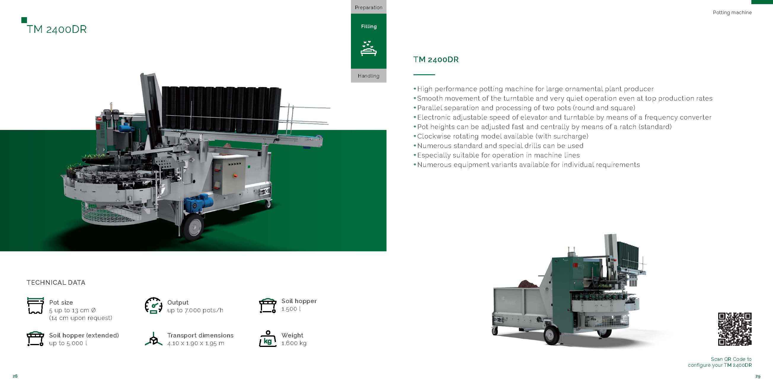 新型上盆機TM 2400DR再次將創(chuàng)新技術與人體工程學相結合。變頻控制的旋轉臺和升降機,通過工作區(qū)域的面板控制,操作簡單,產量輸出精確。新型的基質倉結構確保了更高的效率。這種結構可防止在輸送基質時形成通道阻塞,并且無需人工干預。
