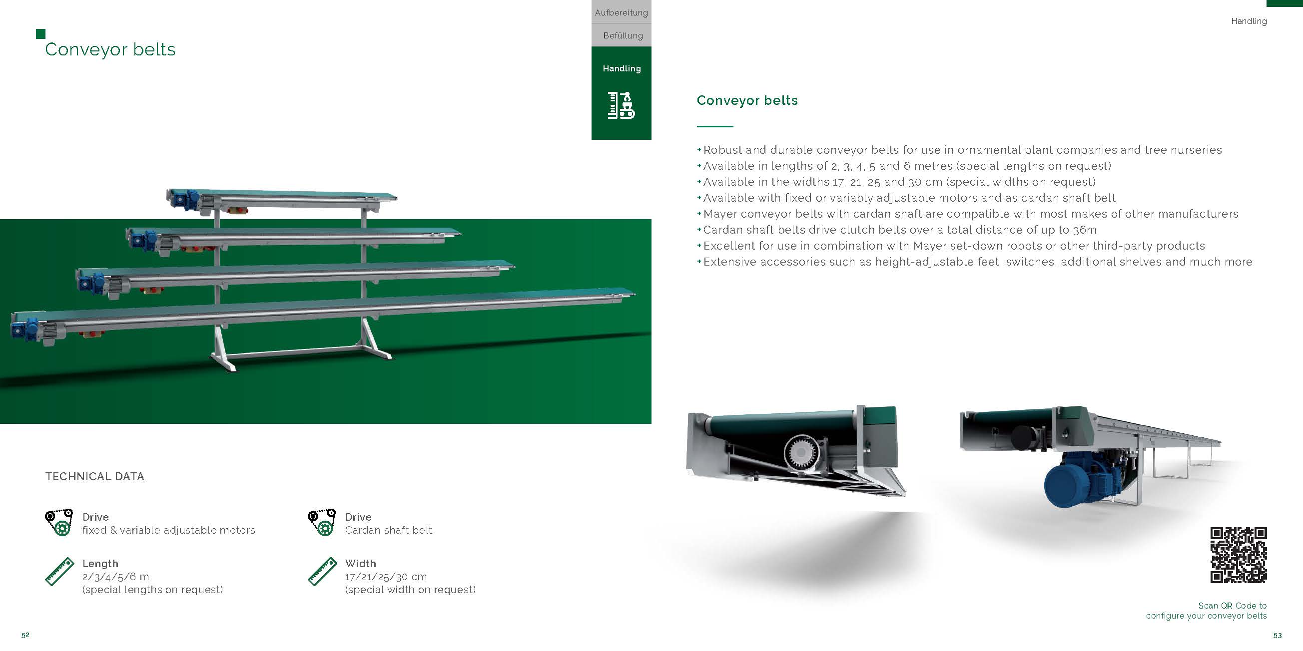 Mayer傳送帶的范圍通過多種附件來完善。這些尤其包括高度可調(diào)節(jié)的支腳,各種長度的電源電纜,花盆的導(dǎo)向桿分流器,支腳上的皮帶分流器,各種花盆大小和寬度的剛性叉,剪刀叉閉合,后背(各種插入物),限位開關(guān)帶電纜,傳送帶上的附加插座等等。